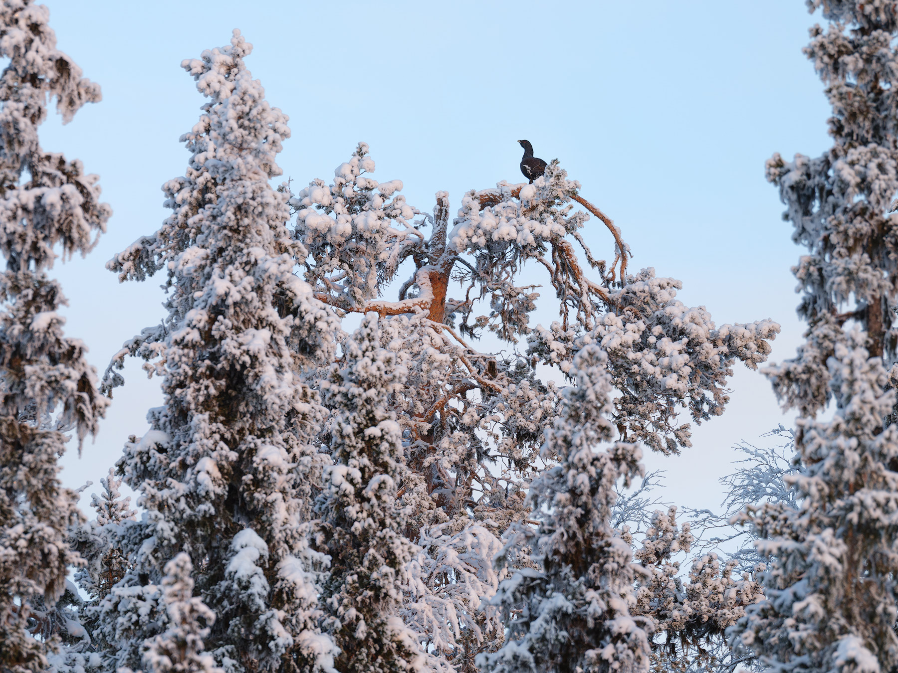 I make my way further out across the marsh, which stretches toward the horizon like an ocean*. In the middle of this ocean, perched in an old pine on a small island of trees, a capercaillie (Tjäder) sits quietly. I am allowed to bring out my camera and enjoy its company through the viewfinder.